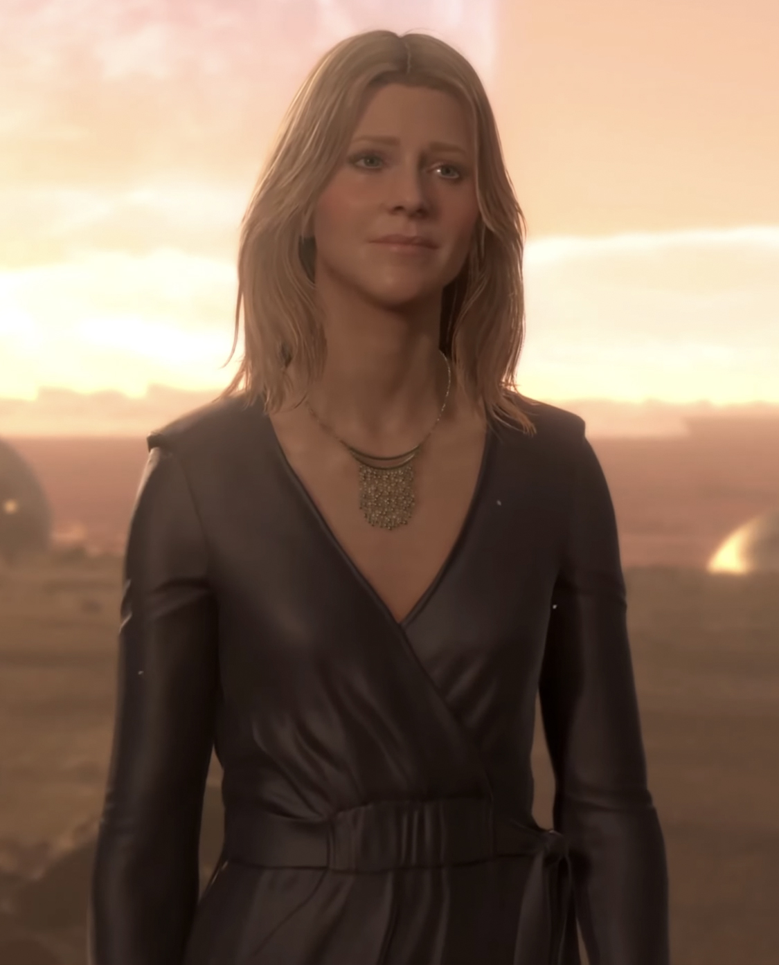 Amelie is a young white woman with an appearance between 25 and 35 years old, blue eyes and mid length blonde hair. She wears a red blazer dress with heel shoes of the same color but sometimes the color of her dress changes to dark blue, expressing a certain emotion. The other only relevant aspect in her appearance is the use of the quipu, crafted and donated by her from Sam, as a necklace.