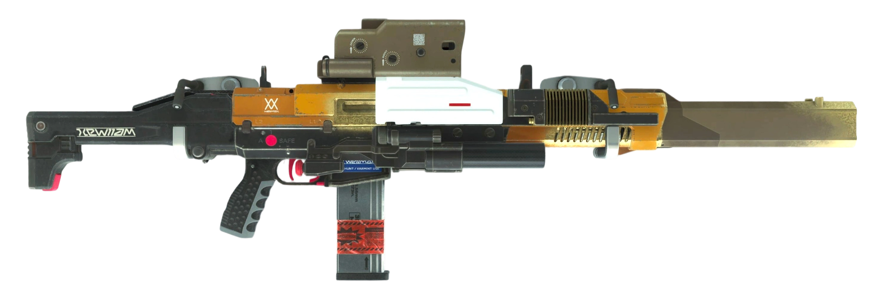 The WM.556 is a fully automatic Lethal Anti-Personnel Weapon originally developed for the U.S. Army’s airborne division. After the Death Stranding, its design was adapted by Bridges, becoming their standard-issue rifle. The weapon’s modular components are stored in a compact cargo case that attaches to the one's suit, allowing for quick field assembly when needed.