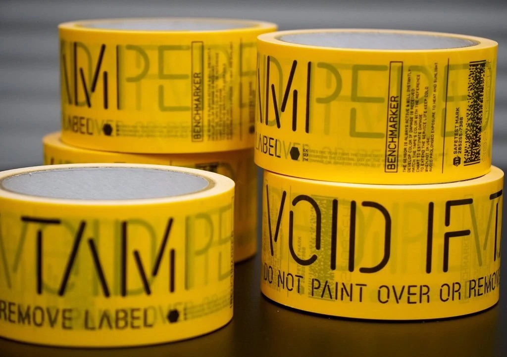 The benchmarker label on the tape reads: "The sensor is always active and will instantly develop color if damage is received. Match the tape's color with the reference chart to estimate damage. To extend the service life keep cold when not in use. Avoid prolonged exposure to heat and sunlight."