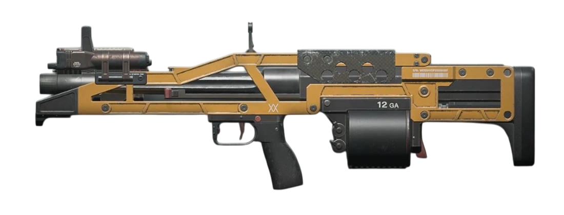 A powerful firearm especially effective at close range. It fires a cluster of pellets that disperse over a wide area, and comes equipped with a light that can be used to dazzle nearby enemies.